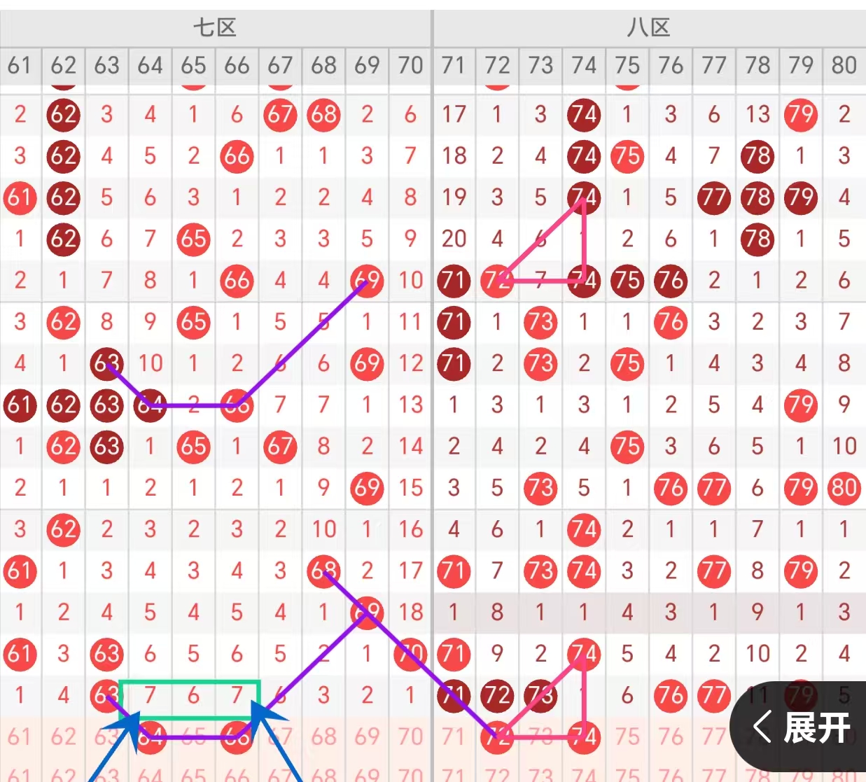 八区:(71-80):72四码斜连走势72和74有同出的概率74形态对称码,八区的号码属于热码走势,本期号码应该至少在两到三个左右,走重的概率比较大,所以本期好72走重!