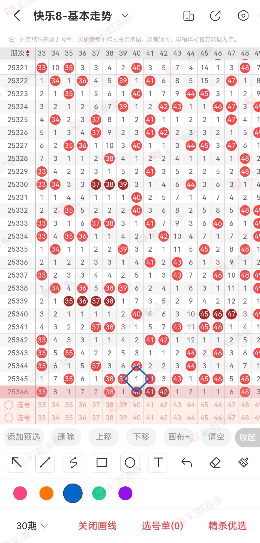 今天我们就简单的聊一下号码的固定搭配。很多人对这个有点儿意外的。我们看一下昨天最标准的两个地方,第一梅花号码通常伴随06同出。昨天40 44是不是开出来一码,且同时同出06。我想这句话在直播过程当中不止说过一天两天吧。从一开始的顺位就能够得出结论。这个大概过去15天差不多。其中零零散散的同出表现。第二个地方就是这两天推荐的追号方案,比方说26 30,不出意外,大家可以在前面几天的直播,或者文章里面可以看到,明确的说过26 30可以尝试追号跟打。最开始灵验的地方是63先出,5期内开出来11 12。这个应该是都抓到了的。其实追号组合真的相当容易,号码足够的敏感。比方说今天记住,11 12在5期内还会再来。大家考虑一下。我们专属里面的追号,今天是第五期,我估计差不多了。让我们拭目以待。