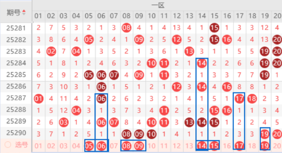 该区间的05号数字我们注意一下出号情况,属于01 03 05号数字斜连号码,本期可以防守一下05 09号数字同出的情况。上期开出了08 09 10号数字三连号,本期我们防守一下就行了,这里前期的13 14 15号数字的三连号码有点像,所以不一定会出号码。三连号13 14 15号数字我们注意一下落下一个号码的情况,其中的14 15号数字我们注意一下出一个号码的情况。上期开出了19 20号数字,本期我们注意一下出一个重号的情况。