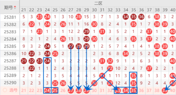 该区间的21 23号数字是属于交叉对称号码,本期不一定会出号码,我们做一下防守就行了。上期开出了25 26号数字,本期我们要注意出重号的情况,也要注意走分边的情况,这里可以重点关注一下24 25 27号数字出号情况。三连号27 28 29号数字已经断号5期了,本期出号机会比较大,我们重点关注一下27 28号数字出号情况。本期的33 34号数字我们也是要注意出一个号码的情况,其中的34号数字是属于空四对称号码,可以重点关注一下。
