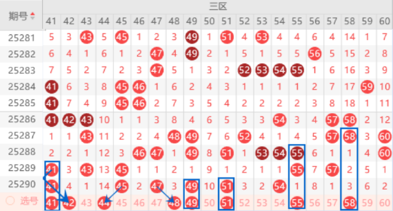 该区间的42 44号数字我们注意一下出号情况,是属于夹号回补号码,可以防守一下同出的情况。上期开出了45 47 49 51号数字,本期我们防守一下出一个重号合夹号的情况,本期重号的我们可以重点关注一下47 49号数字的出号情况,夹号可以关注一下48号数字的出号情况。本期的55号数字我们注意一下出号情况,属于对应号码,本期可以防守一下55 58号数字同出的情况。