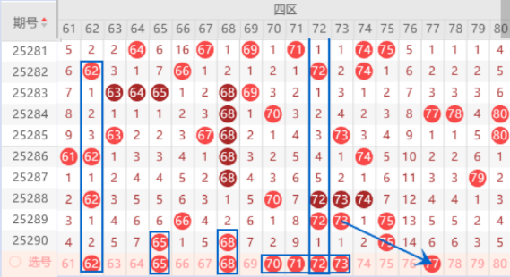 该区间62号数字我们注意一下落号情况,属于乱序312走势,本期可以防守一下62 65号数字或者65 68号数字同出的情况。本期的66 67号数字出号机会不是很大,我们可以直接放弃了。本期的71号数字我们注意一下出号情况,本期可以防守一下71 73号数字同出的情况。本期的72号数字是属于151走势,73号数字是属于421走势,都是有出号机会的,我们可以关注一下。本期的77 78号数字我们注意一下落下一个号码的情况。