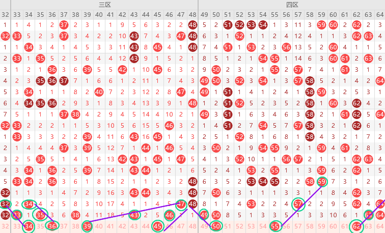 四区胆尾0尾1尾4尾,边号49 50 51 62 63 64出1-2码,重号49 50 63 64出一码,形态上50 55 62是斜连号,上图已勾画,重号先看50其次64,大概率50 64二出一,遗漏值52 56二出一,结论关注五码50 51 55 56 64防54