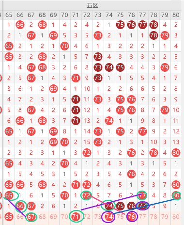 五区胆尾3尾,4尾,边号65 66 67 68 73 74 78出1-2码,重号66 67 74 75 76 77出一码,形态上67 71 74 76是斜连号,上图已勾画,短期规律缩小范围3连号4连号下面出重号,那么本期74 75 76三出一,优先看74其次75,同尾号出2期,本期防同尾号68 78,5尾出3期,防65,隔2期号出三期,本期68 71是隔三期号,68 71二出一,结论关注五码65 68 73 74 78