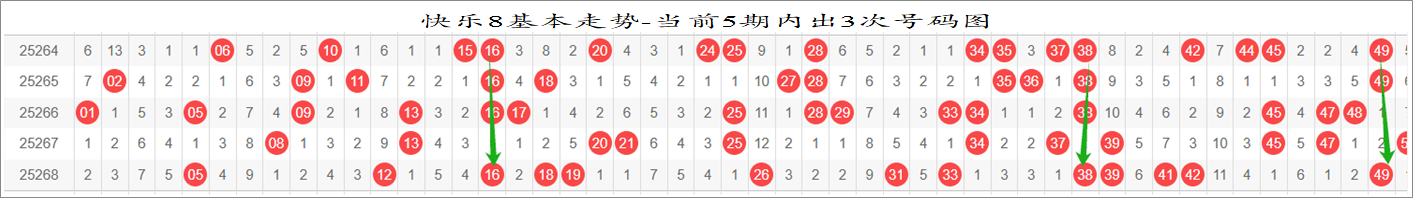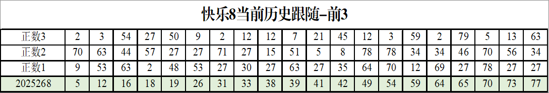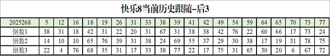 我感觉选热的同时,还要注意防冷条件开出,可以直接选取每个号码跟随出次前三的号码,也可以考虑把出次最后的三个数字加进去,不过这样可能号码太多,可以尝试。图上也能看出单独号码跟随的情况,我就不一一统计每个号码的出次了,我这里考虑提高概率,取每个号码历史跟随的前三号码和后三号码,根据2025268期的号码,我关注正数3和倒数3的号码号码为: