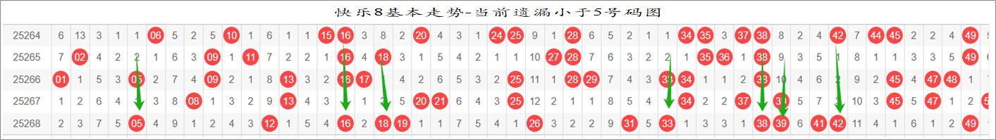 所以这个条件值得关注,从号码分布图上我们可以分析出,遗漏小于5期的号码有: