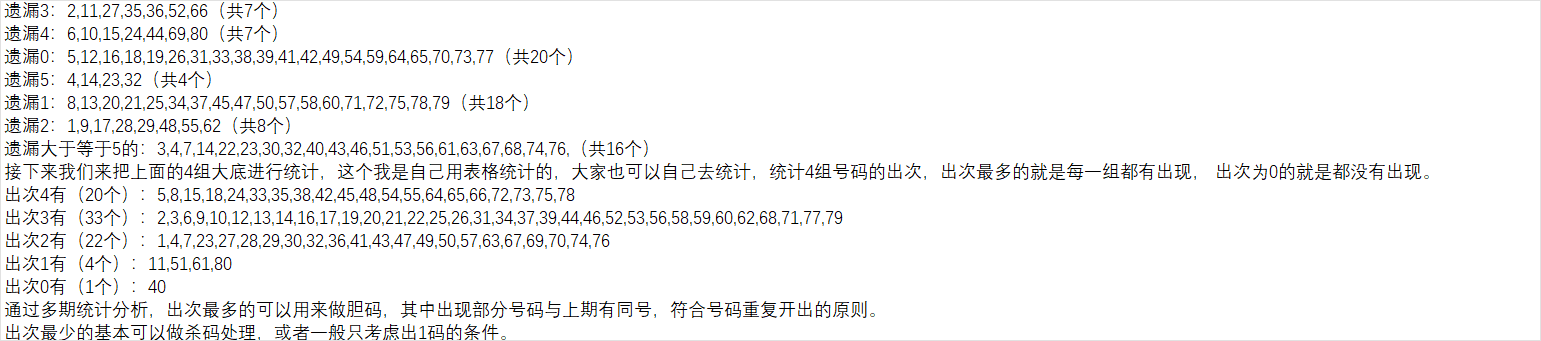 如果把对数和补数合起来有40个号码,中间可能还会产生一下重复数,通过近几期的统计分析,以上期数据进行补数对数计算推算下一期的概率不高。为提高概率,我主要是用前两期的数据来进行对数补数推算,然后再组成一个集合,作为我的第四组大底号码。