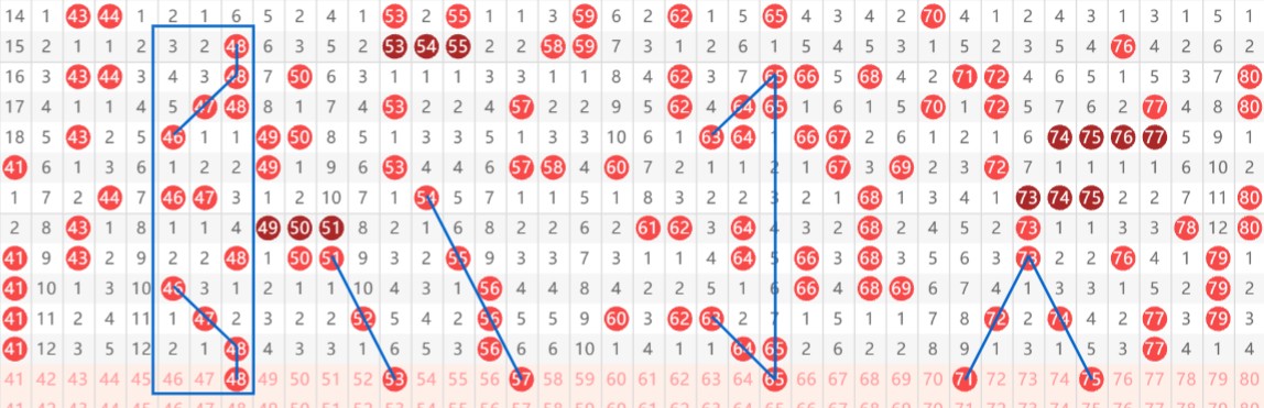 【第二区间41-80】:上期开出6个号码。本期推荐:48-53-57-65-71-75六个号码。48重号考虑,上下对称(如图),同时为8尾斜连号码;53斜连三期,3尾斜连号码;57斜连号码,7尾斜连;65斜连、重号、上下对称号码,四区间较为常见出号形态;71-75斜连号码,金字塔出号形态。区间推荐重点号码:三小区间48-57,四小区间65-75。