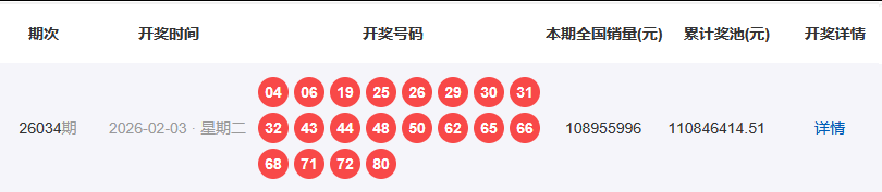 1、开奖号码:04 06 19 25 26 29 30 31 32 43 44 48 50 62 65 66 68 71 72 80