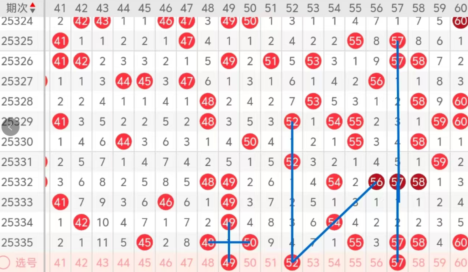 第三区间的走势分析:第三区间上期开出了七个号码球,主要的落号点位在三区间的前后半区,走出了三奇四偶的形态走势,上期三区间的前半区落下了三个号码球,后半区落下了四个号码球,整个三区间处于走热的趋势,根据三区间的走势规律,今天的三区间我们主看前半区热码49的回,补,走出了梅花的形态走势!再看后半区冷码52的落位,以及57的重码走势形态,这三个号码球都有落下的机会,大家还是重点关注49 57的组合,52可以防守一下!参考为主!