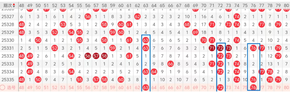 第四区间的走势分析:第四区间上期开出了七个号码球,主要的落号点位在四区间的后半区,走出了一奇三偶的形态走势,上期四区间的前半区没有号码球落下,后半区落下了四个号码球,整个四区间处于走冷的趋势,根据四区间的走势规律,今天的四区间我们主看前半区热码的回补63这个号码球的落位,再看后半区热码72隔一期的落位,一家夹码76,走出了重码的走势形态!这三个号码球都有落下的机会,大家可以自由组合!重点关注63 72的组合!参考为主!