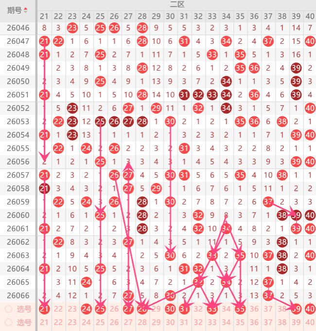 二区间注意打底号23.25.26.28.30.32.34.35.40中关注3-4码开出机会,
