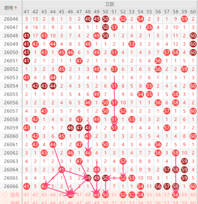 三区间在近期的走势上分析,上期三区间开出了7码开出,而且开出的形态是空位回补和隔期回补三连号走势,上期小妹在文章中布局到了2码开出,那么本期三区间重点关注的形态是空位回补,隔期回补,那么本期首先注意空位回补上的46.47.51.中选择1-2码回补机会,而隔期回补上注意49.48.52.53.号中参考1-2码回补机会,上期重点关注在重码走势上布局到了0码,那么本期重点关注在空位回补上布局一码订胆机会,如图所示。而三区的打底号是42.46.47.48.49.50.51.53.54.58.中参考3-4码开出机会,