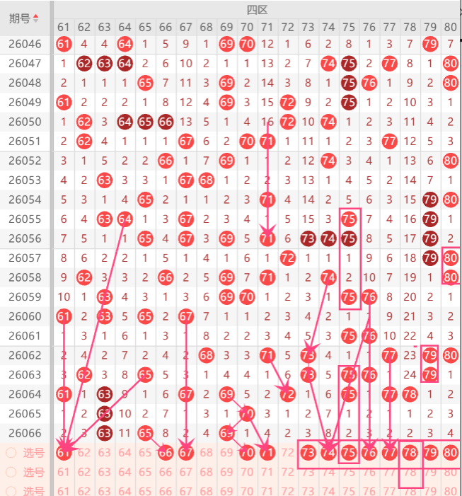 .那么四区间关注的打底号是66.67.70.71.73.75.76.78.79.80中参考3-4码开出机会