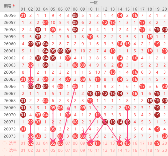 一区在近期的走势分析,近期一区间是一个温热形态,上期一区间开出了6码,而且上期区间开出的形态是隔期回补和空位回补走势,上期小妹在文章里布局到了3码开出,那么本期一区间重点关注的形态是空位回补,重码走势,隔期回补,那么本期首先注意空位回补上的11.14.15.16中回补1-2码机会,而重码走势上的02.06.08中布局1码走重机会,至于隔期回补上01.05.19中选择1码回补机会,上期重点关注在对称形态上布局到了1码开出,那么本期重点关注在空位回补上布局一码订胆机会,如图所示。