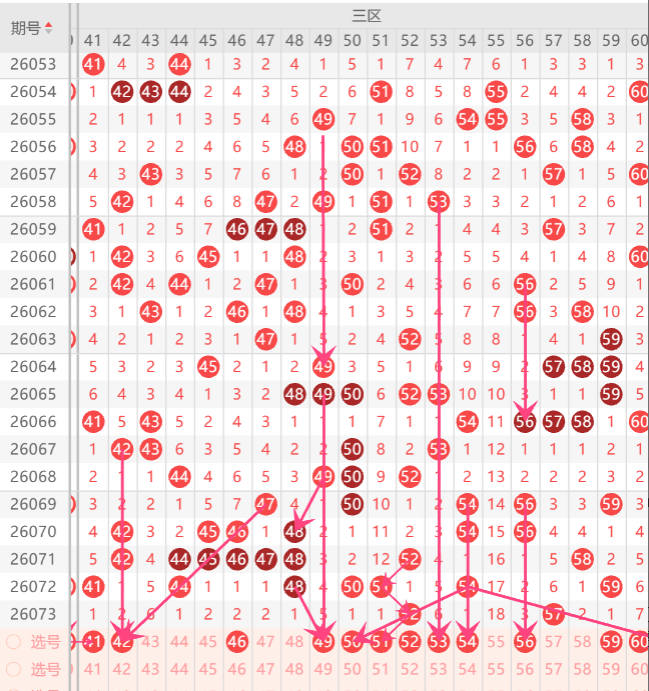 而三区的打底号是41.42.46.47.49.50.51.53.54.56.59中参考3-4码开出机会,