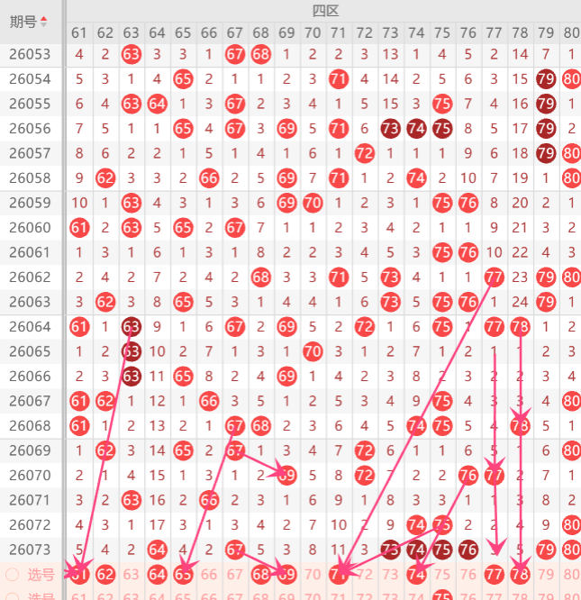 四区在近期的走势上来判断机会的话,整体区间开出走热形态,上期四区间直接爆区开出了8码,而且上期区间开出的形态是空位回补和重码四连走势,上期小妹在文章中布局到了3码开出,那么本期四区间我们重点关注的形态是空位回补,对称形态,斜连号下拉,那么本期首先注意空位回补上的61.62.65.71.中布局一码回补机会,而对称形态上的69.68.中选择一码开出机会,至于斜连号下拉位置上的72.77.78中布局一码下拉机会,上期重点关注不在空位回补上布局到了3码开出,那么本期重点关注在孤码分边上布局一码订胆机会,如图所示