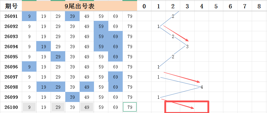 本期看好开出的范围是两码走势至四码走势之间。九尾上期开出一码走势,前一期开出的四码,上期均没有开出,那么本期一共有四个九尾的间隔1的号码,看好能够开出其中一个或者两个,比较看好的是号码29和号码49的开出。另外首码看好号码09的开出,尾码看好号码79的开出。