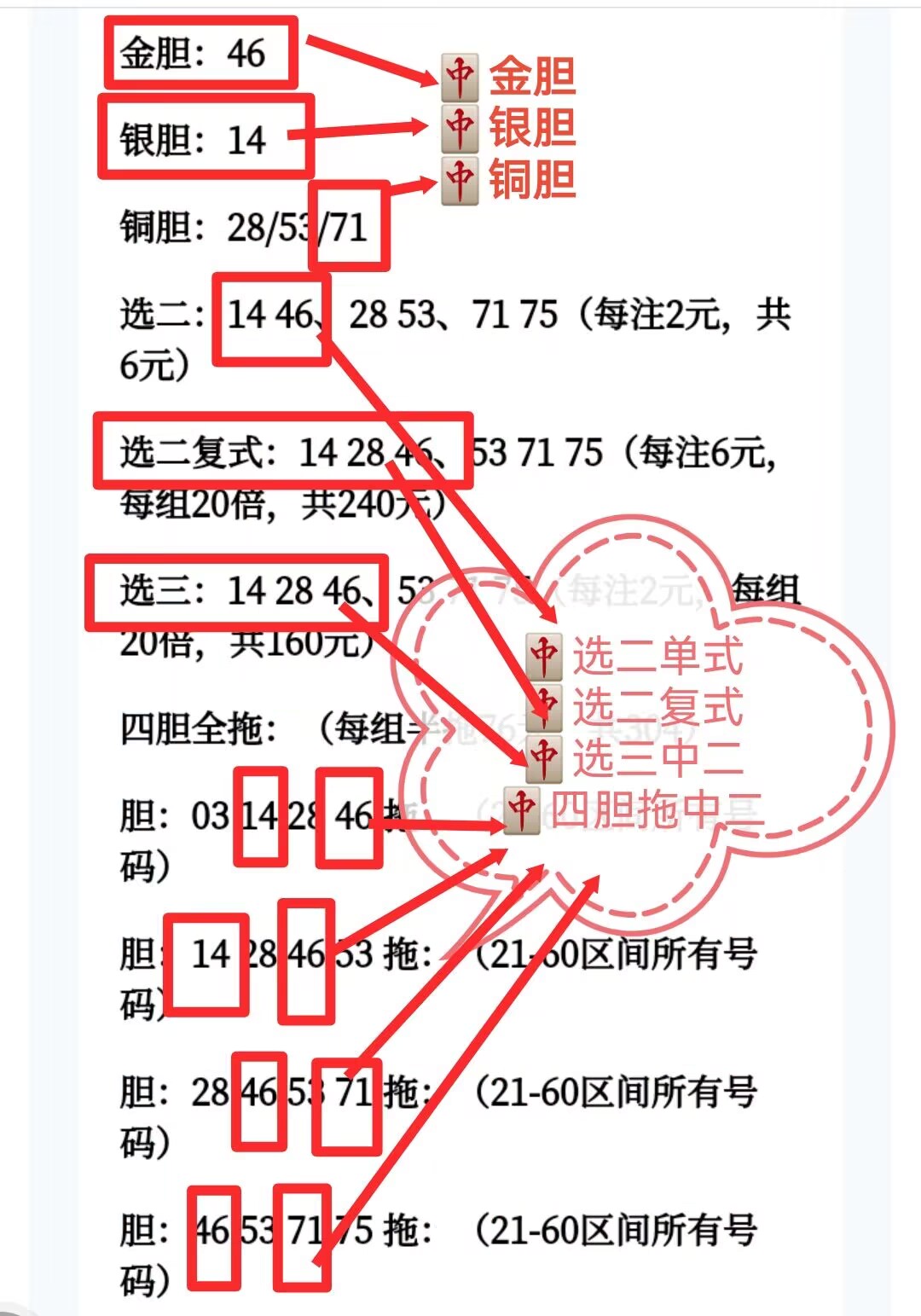 会员文章有详细的选号推荐:金银铜胆、选二、选三、选五、四胆拖、五码复式,小成本中大奖。