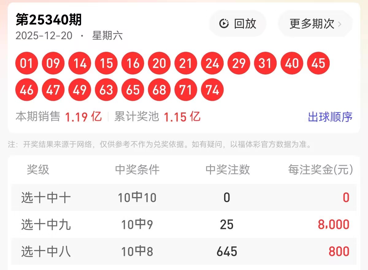 上期福彩快乐8第 2025340期开奖号码为【01 09 14 15 16 20 21 24 29 31 40 45 46 47 49 63 65 68 71 74】,其中大小比为9:11,奇偶比为12:8,和值为748,跨度73,四区间比为6:5:4:5。下面是对本期对于每个号码的详细分析。