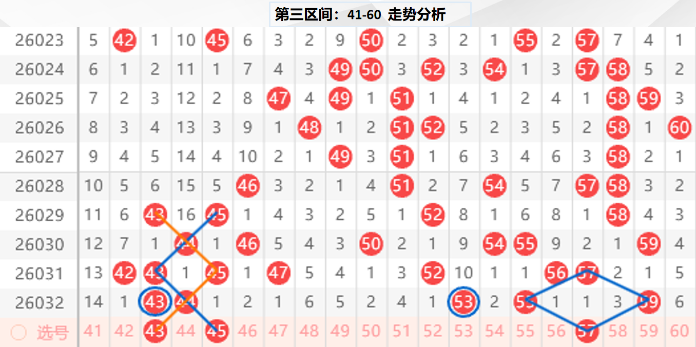 三区分析:【41-60】(走势图标注号码非小黄车大底,请谨慎参考,具体思路将在直播间分享讨论)