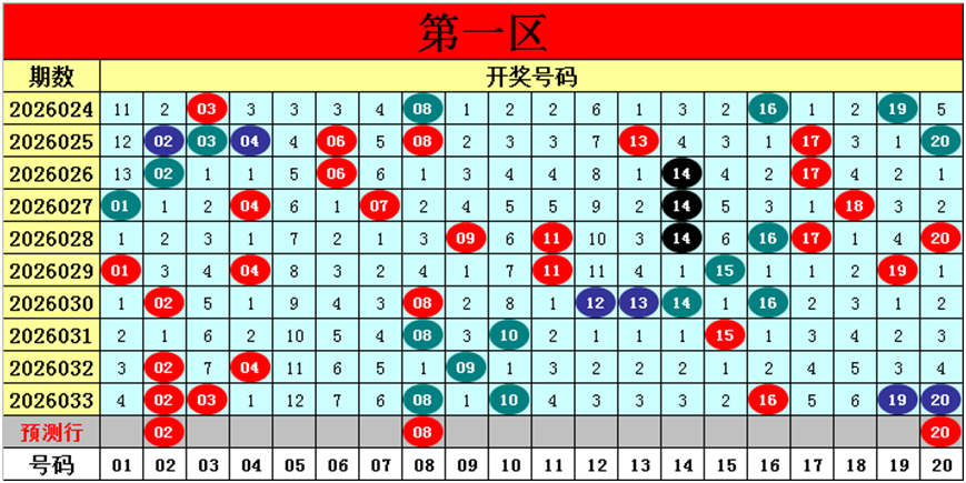 目前第一区包含10个热码:重码7个02、03、08、10、16、19、20,邻码3个04、09、15,孤码0个;包含8个温码:邻码5个01、07、11、17、18,孤码3个12、13、14;包含2个冷码:邻码0个,孤码2个05、06;号码冷温热个数比为2:8:10,重号、邻码、孤码个数比为7:8:5。