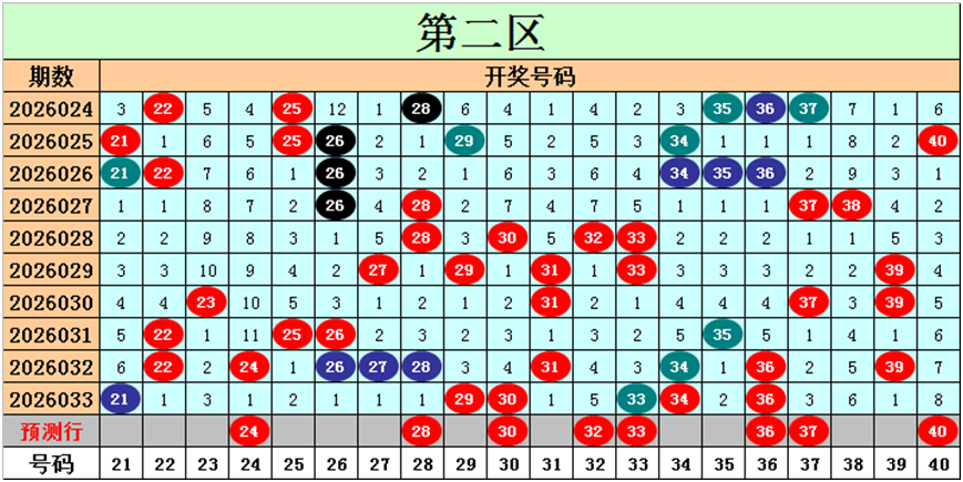 目前第二区包含15个热码:重码6个21、29、30、33、34、36,邻码4个22、28、31、35,孤码5个24、25、26、27、39;包含4个温码:邻码2个32、37,孤码2个23、38;包含1个冷码:邻码0个,孤码1个40;号码冷温热个数比为1:4:15,重号、邻码、孤码个数比为6:6:8。