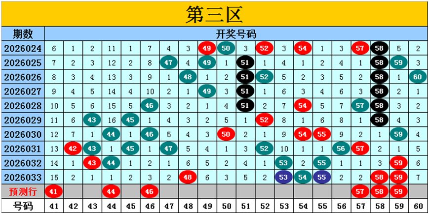 目前第三区包含14个热码:重码6个48、53、54、55、58、59,邻码4个47、52、56、57,孤码4个42、43、44、45;包含4个温码:邻码1个49,孤码3个46、50、51;包含2个冷码:邻码1个60,孤码1个41;号码冷温热个数比为2:4:14,重号、邻码、孤码个数比为6:6:8。