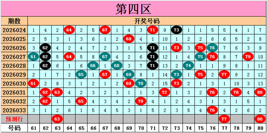 目前第四区包含8个热码:重码1个76,邻码0个,孤码7个62、63、65、70、72、78、80;包含12个温码:邻码2个75、77,孤码10个61、64、66、67、68、69、71、73、74、79;包含0个冷码;号码冷温热个数比为0:12:8,重号、邻码、孤码个数比为1:2:17。