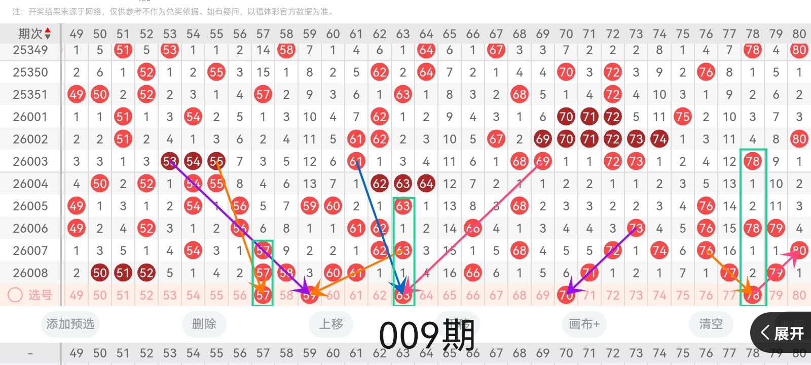小梁结合上图中的画线思路分析得出:号码57与前几期开出的号码呈右斜三连的走位且呈直三连回补的走势;号码59与前几期开出的号码呈隔三期回补的走势且呈左斜三连右斜六连的走位;号码63与前几期开出的号码呈左右斜三连的走位且呈连续隔期回补的走势;号码70与前几期开出的号码呈左斜四连的走势且呈隔六期回补的走位;号码78与前几期开出的号码呈左右斜三连的走位且呈连续隔两期回补的走势。