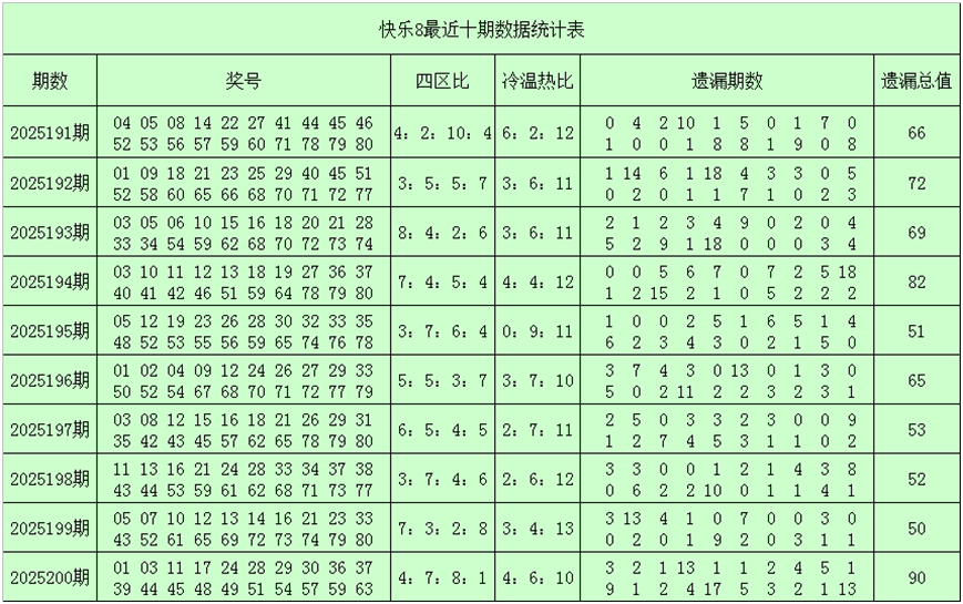 一、快乐8第2025201期奖号分析(定义:遗漏0-2期号码为热码,遗漏3-6期号码为温码,遗漏7期及7期以上号码为冷码,重码为上期开出奖号,邻码为上期没有出现,但与上期奖号差值为1的号码,例如上期开出奖号04,没有出现号码03和05,则本期03和05都为邻码,其它则为孤码。