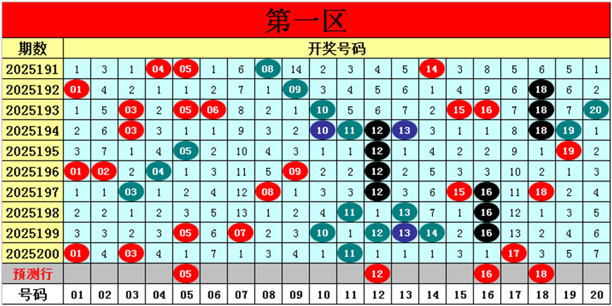 目前第一区包含11个热码:重码4个01、03、11、17,邻码3个10、12、16,孤码4个05、07、13、14;包含7个温码:邻码3个02、04、18,孤码4个08、09、15、19;包含2个冷码:邻码0个,孤码2个06、20;号码冷温热个数比为2:7:11,重号、邻码、孤码个数比为4:6:10。
