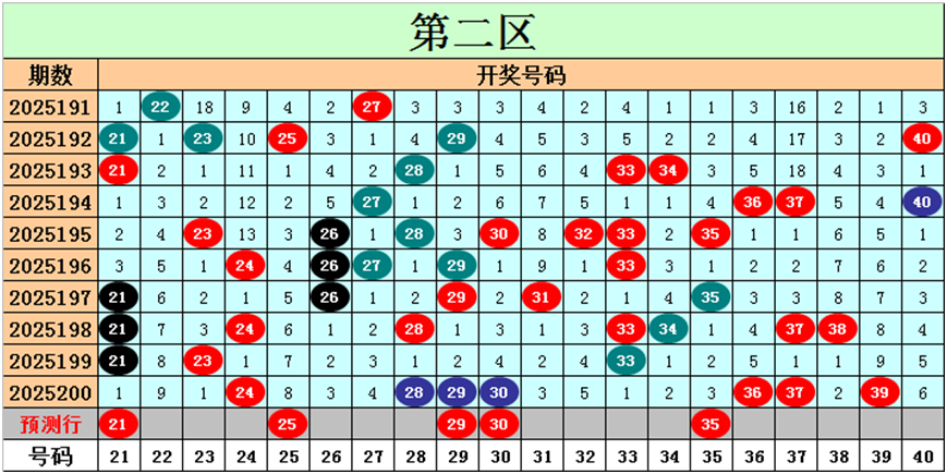 目前第二区包含12个热码:重码7个24、28、29、30、36、37、39,邻码2个23、38,孤码3个21、33、34;包含6个温码:邻码4个27、31、35、40,孤码2个26、32;包含2个冷码:邻码1个25,孤码1个22;号码冷温热个数比为2:6:12,重号、邻码、孤码个数比为7:7:6。