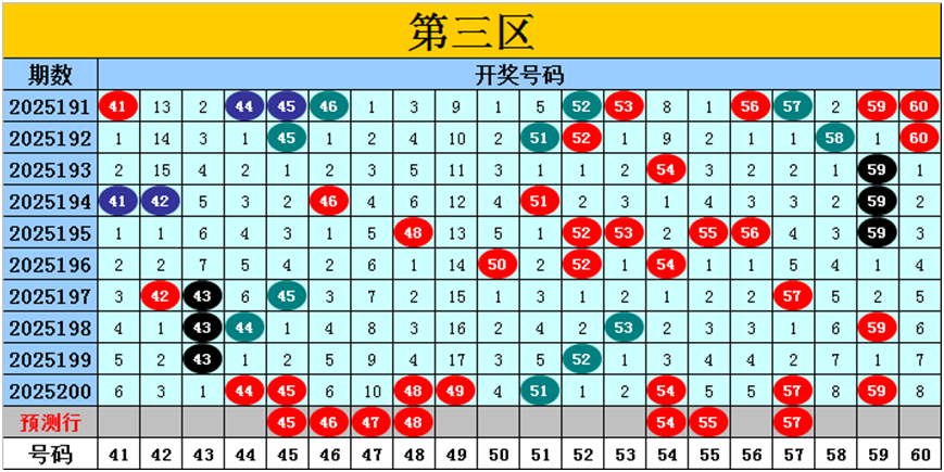 目前第三区包含11个热码:重码8个44、45、48、49、51、54、57、59,邻码3个43、52、53,孤码0个;包含6个温码:邻码4个46、50、55、56,孤码2个41、42;包含3个冷码:邻码3个47、58、60,孤码0个;号码冷温热个数比为3:6:11,重号、邻码、孤码个数比为8:10:2。