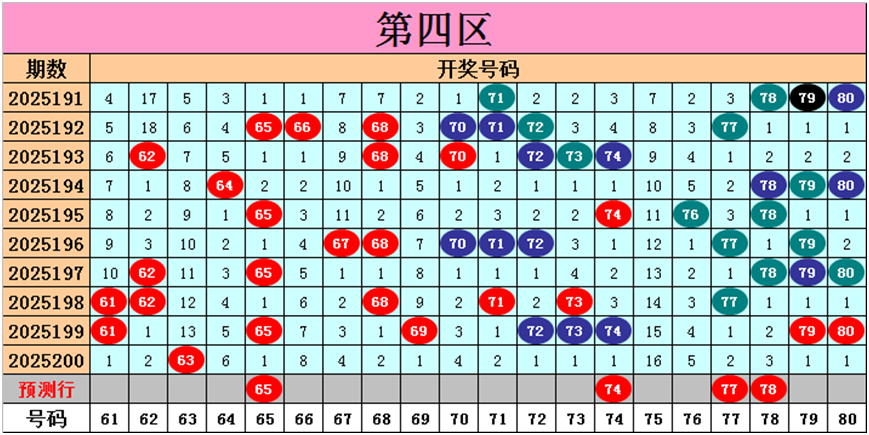 目前第四区包含13个热码:重码1个63,邻码1个62,孤码11个61、65、68、69、71、72、73、74、77、79、80;包含5个温码:邻码1个64,孤码4个67、70、76、78;包含2个冷码:邻码0个,孤码2个66、75;号码冷温热个数比为2:5:13,重号、邻码、孤码个数比为1:2:17。