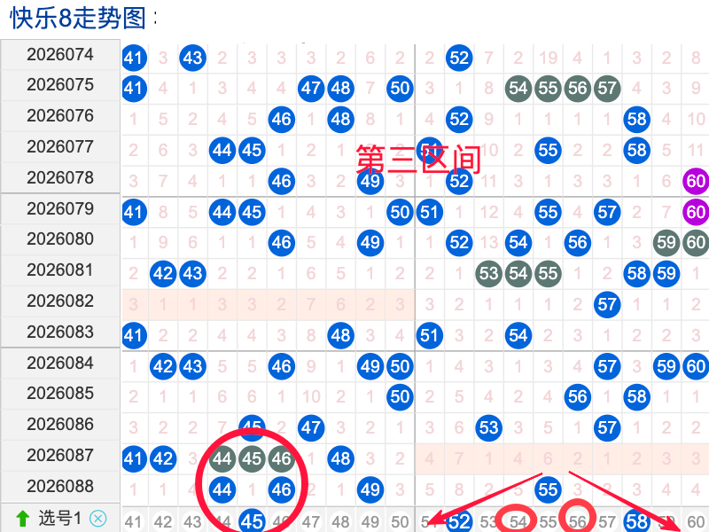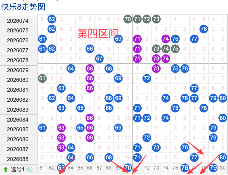 上期四区间开出了6个奖号(64.66.68.71.77.80)上期的四区开6个奖号呈现了一个递增趋势,开出的奖号6回补3码7回补2码,先来看号码63在近 30 期内属于还是稳定的号码,近期出现频率相对,偶尔会间隔多期后出现一次,这个号码要注意防守,号码70具有一定的间歇性近期活跃度不是很稳定比如有时会间隔38期就再次出现,有时会间隔多期,近期整体出现频率比较,近期还是要关注的.号码76活跃度近期比较,有一定的间歇性,整体走势有一定的波动性.