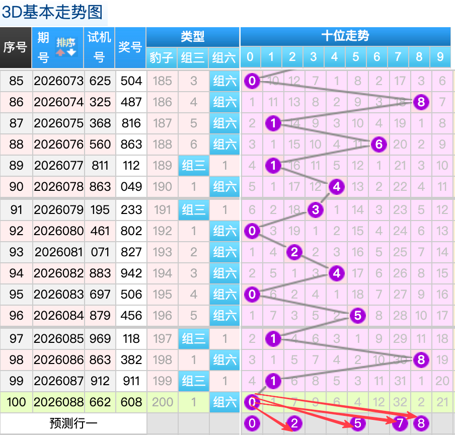 上期3D十位开出的奖号0号,上期在十位上0号球这个号码是一个热号码的落位点,本期来看0号在十位上要注意这个号码是有机会继续走出热号位落位的趋势这里的号码回补形态注意防守就好,再来5号球这个点位注意防守走出5跨号码的落位趋势7号球这个最大冷号的落位回补要注意参考。8号球要注意走出8跨号码的落位回补。