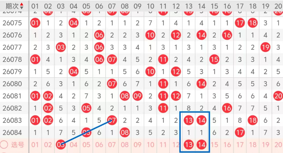 第一区间的走势分析:第一区间上期开出了三个号码球,主要的落号点位在一区间的前半区,走出了两奇一偶的形态走势,上期一区间的前半区落下了两个号码球,后半区落下了一个号码球,整个一区间处于走冷的趋势,根据一区间的走势规律,今天的一区间我们主看一区间前半区03这个号码球斜连码的落位,再看后半区13 14姊妹对隔期的回补,注意03 13的组合,这三个号球建议大家打个三胆拖,或者打个三码复二比较稳妥,参考为主!
