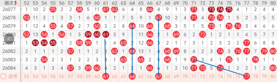 第四区间的走势分析:第四区间上期开出了五个号码球,主要的落号点位在四区间的后半区,走出了一奇四偶的形态走势,上期四区间的前半区落下了一个号码球,后半区落下了四个号码球,整个四区间处于走热的趋势,根据四区间的走势规律,今天的四区间我们主看前半区61 64 67走势的落位,今天落下的机会很大,再看77的回补,走出了对称的走势!这四个号球建议大家打个四胆全托,或者打个四胆小拖比较稳妥,参考为主!