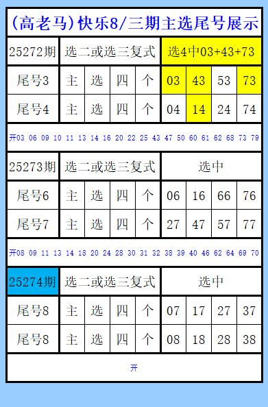 快乐8第274期图文(高老马),主攻尾号展示,视频上期中金胆20