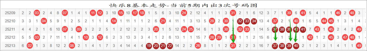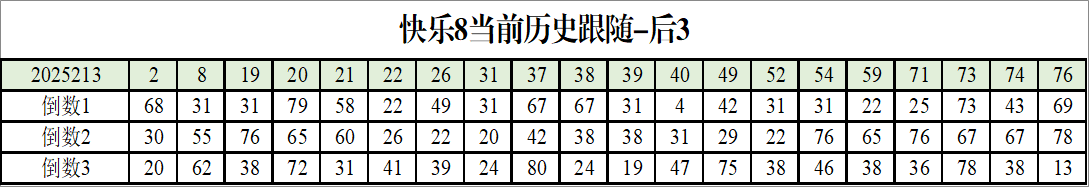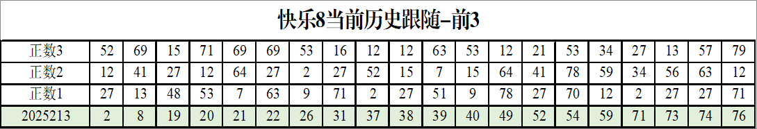 我感觉选热的同时,还要注意防冷条件开出,可以直接选取每个号码跟随出次前三的号码,也可以考虑把出次最后的三个数字加进去,不过这样可能号码太多,可以尝试。图上也能看出单独号码跟随的情况,我就不一一统计每个号码的出次了,我这里考虑提高概率,取每个号码历史跟随的前三号码和后三号码,根据2025213期的号码,我关注正数3和倒数3的号码号码为: