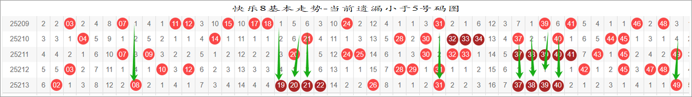 所以这个条件值得关注,从号码分布图上我们可以分析出,遗漏小于5期的号码有: