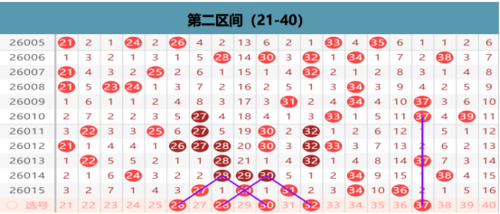 本区上期开出5码的区间布局,那么在本期我们优先考虑的就是同形态的出号点位,区间的同形态的位置有29 34的重码同形态,27 31的分边形态,31 34的同路形态的点位, 在这几个位置的下方我们各选择一码的出号机会,打容错的可能性,在空位上我们关注的还是小周期的出号点位,21 22 24 25 38的位置上我们做择一的出号选择,在温冷的位置上我们做防守出号的可能性,那么其他位置上的出号就不是我们重点考虑的位置了。