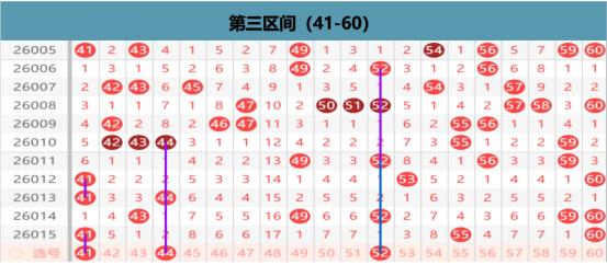 本区上期开出3码的区间布局,那么在本期我们还是形态分类,41 60的龙头凤尾的出号点位,41 55的孤码的出号点位,在这个位置上我们是要考虑41 60只要一方出号的可能,已经同形态的点位上我们也是只考虑一方出号的可能性,这个位置上就是要考虑容错的出号点位,在空位上,我们关注的就是43 49 52的同形态放空的位置的出号选择,在这个位置上我们优先考虑的就是分边的出号点位,在46的同尾放空的位置上,我们也还是要考虑一码出号的机会,45 46 47的位置上我们做择一出号的可能性,在小周期的位置上43 44 49 52的位置上我们做择一出号的可能性,那么其他位置的出号就不是我们考虑的重点位置了。