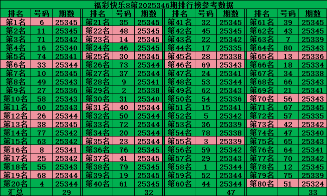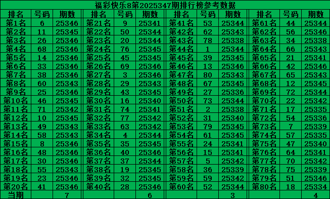 综上所述,福彩快乐8第2025347期推荐号码: