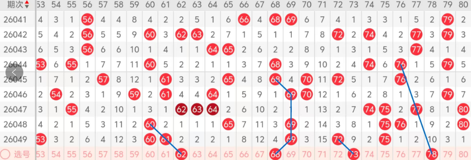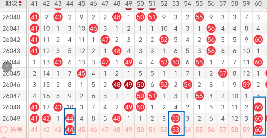 第三区间的走势分析:第三区间上期开出了六个号码球,主要的落号点位在三区间的前半区,走出了两奇四偶的形态走势,上期三区间的前半区落下了四个号码球,后半区落下了两个号码球,整个三区间处于走冷的趋势,根据三区间的走势规律,今天的三区间我们主看重码的落位,主看44 53的重码,防守60走出三重码,这三个号码球几天落下的机会很大,大家注意多关注一下!这三个号球建议大家打个三胆拖,或者打个三码复二比较稳妥,参考为主!