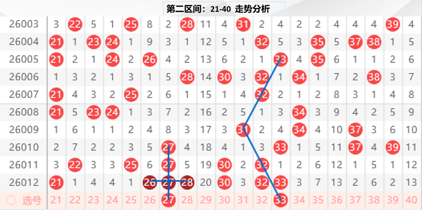 二区分析:【21-40】(走势图标注号码非小黄车大底,请谨慎参考,具体思路将在直播间分享讨论)