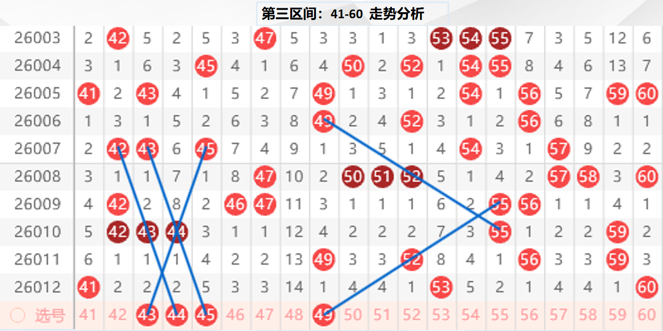 三区分析:【41-60】(走势图标注号码非小黄车大底,请谨慎参考,具体思路将在直播间分享讨论)