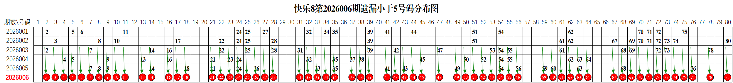所以这个条件值得关注,从号码分布图上我们可以分析出,遗漏小于5期的号码有: