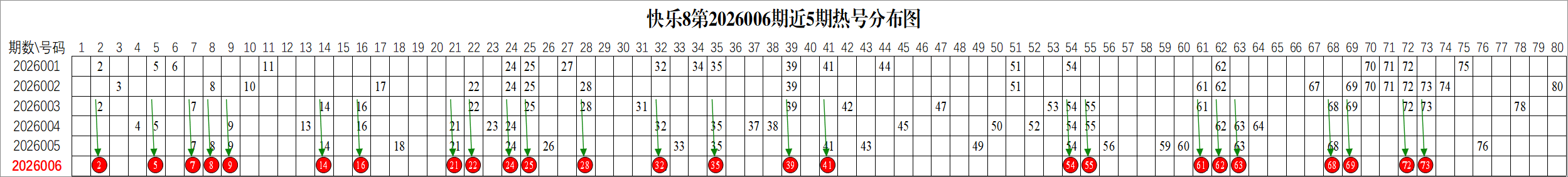 这个条件可以理解为追热号,主要是选取遗漏小于5期的号码来做大底,通过号码分布图我们也能看出,每期都有重复号,都有上期号码的相邻号,再仔细观察下面的部分分布图,2026005期,按照【号码(遗漏)】的方式统计出来是:7(1),8(2),9(0),14(1),18(6),21(0),24(0),........。可以看出遗漏小于5的号码比较常见,这就是一个大概率事件,我们就可以用这个梳理出一部分号码,用来作为我们交集的一组号码。